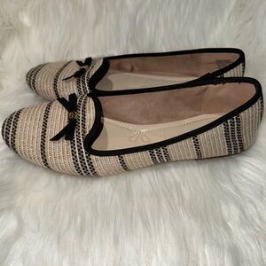 These Charter Club loafers feature a chic black and cream striped pattern, complemented by a delicate bow detail. The slip-on design and rounded toe offer both comfort and style, making them perfect for everyday wear. Crafted with a woven texture, these flats exude a casual yet sophisticated appeal.