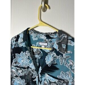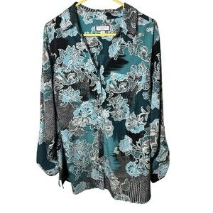 Charter Club Blouse Plus Size 2X Blue Floral Button Roll Tab Sleeve Abstract