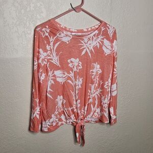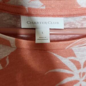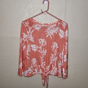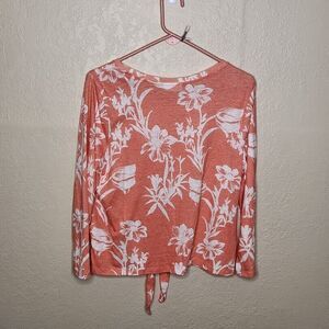 Charter Club Blouse Top Women's Large Peach Floral Linen Tie Front Round Neck