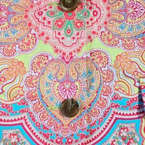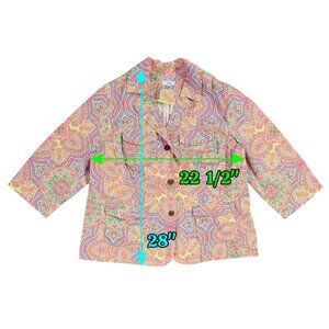 Good used condition, with no stains or tears. A unique, artsy button-up jacket, with abstract boho shapes. Multicolor. Has a notched lapel collar, flap pockets, and is unlined. Lightweight.