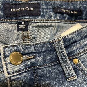 These Charter Club Bristol Capri jeans feature a classic medium blue denim color and a sleek silhouette that flatters the figure. The jeans are designed with a visible waistband and a zipper fly for a secure fit.