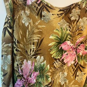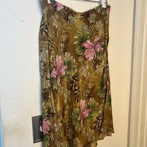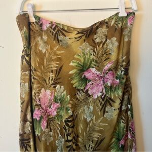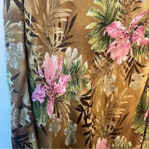 Chic brown midi skirt with pink and green floral pattern. Ideal for casual outings. Womens size 12 side invisible zipper. Approx 27 inches long