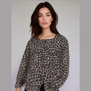 Details: Sharp button down blazer jacket in a bold giraffe print. Scoop neck, 2 front flap pockets, button cuffs.