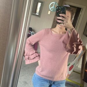 amazing pre-love condition. Petite Small fits like a small, pure cashmere, beautiful light blush pink color, ruffle bell sleeves, easy pop over sweater, super cozy and warm