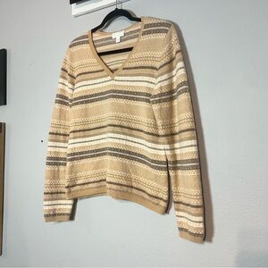 Charter Club Cashmere Sweater Women’s Large V-Neck Striped Beige Brown Tan