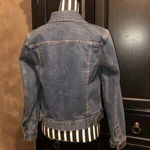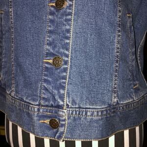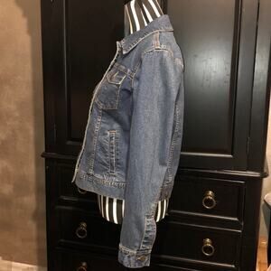 This is an adorable Charter Club Jean jacket. It has 2 button pockets on front top each side. And, 2 open pockets on each side of the front bottom. It is in excellent condition. Looks barely used if at. It is marked “Charter Club”.
