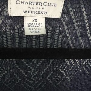 Elegant deep blue cardigan by Charter Club. Features intricate knit patterns. Ideal for layering.