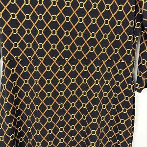 petite wrap style dress, Charter Club dress, chain print dress, black gold dress, geometric pattern, office dress, women's business casual, stretchy wrap dress, flattering silhouette, size PL dress, faux wrap