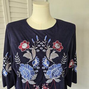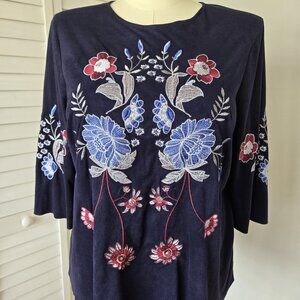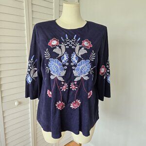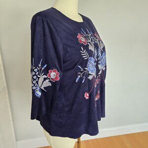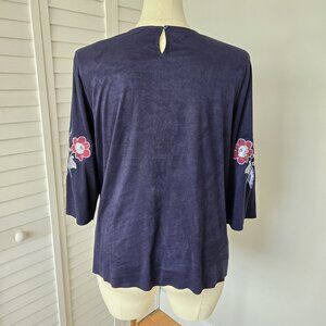 Charter Club navy faux suede top featuring intricate floral embroidery in vibrant blue, red, and white tones. This relaxed-fit blouse offers a soft suede-like texture and bohemian charm with 3/4 sleeves and a keyhole back closure.