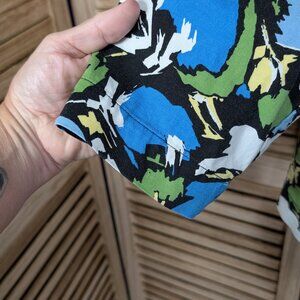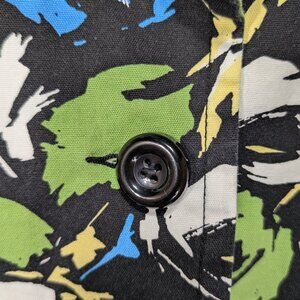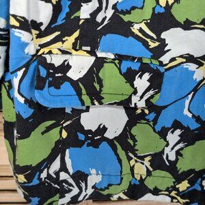 Stylish jacket with a vibrant floral pattern. Features blue, green, and black colors.