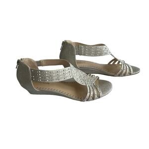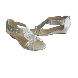 Charter Club Ginifur wedge sandals created for Macy’s. Shoes are in a silver glittery look, featuring slender straps that twist and curve amid sparkling rhinestones set atop a sleek wedge heel for a stunning dressy finish. Round toe with zipper closure at back, rhinestone details at straps and a 1-1/2" wedge heel. Shoes only wore once inside. Bought for a wedding but I ended up wearing another pair. Excellent condition.