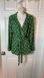Stylish green wrap top featuring a white chain pattern. Perfect for a chic look.Tiny Flaw back collar has snags In material. See pictures for further inspection.