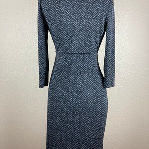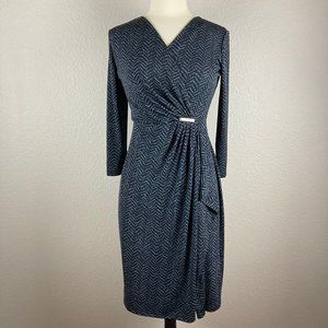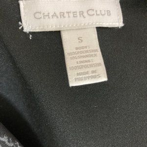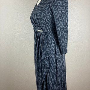 Sophisticated and timeless, this faux-wrap dress from Charter Club created for Macy's draws understated elegance from gentle gathers and a silver tone accent at the waist. 3/4 sleeves, gathers and "wraps" at the waist with hardware. Pullover styling, surplice / v-neckline. Hits at about the knee. Black/gray pattern. Stock photo provided for additional idea of fit/length, same dress different color. Unlined. Machine washable, polyester/spandex. Size small. Excellent condition, washed once but never worn.
