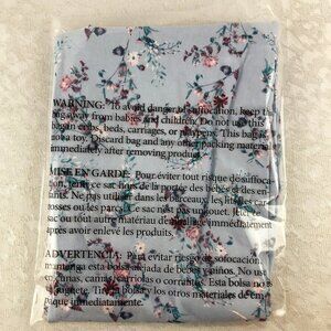Pants are light blue with a charming floral print featuring hues of peach, maroon, white, and blue