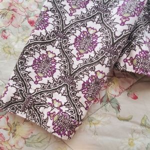 Uniquely patterned linen blazer in a color pallet of cream, plum, light green with brown buttons. Long sleeved, like new condition. Front pockets, cuffed sleeves. 97% cotton, 3% spandex. Size M.