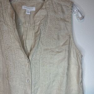 Charter Club Linen Embroidered Sleeveless Tan V Neck Button Shirt Women’s Sz S