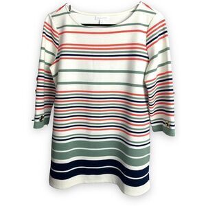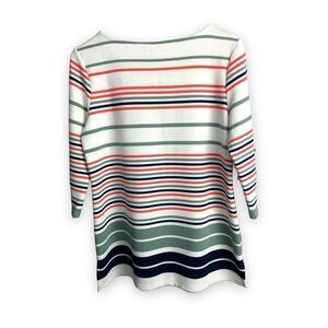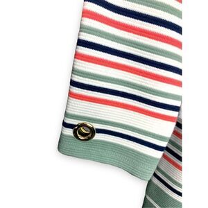 Longline ribbed soft blouse with 2” side slides. Navy blue, white, green and melon stripes. Two ring rivets on each sleeve.