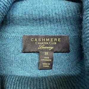 Charter Club Luxury sweater made of 100% cashmere in a beautiful teal blue shade. Features a classic turtleneck, long sleeves, and a soft, luxurious knit. Perfect for layering in cooler weather or wearing on its own for timeless style. Womens Plus Size 3X. See photo for measurements.