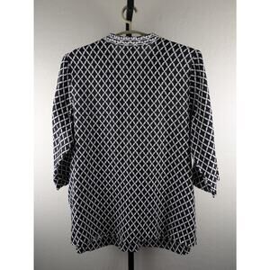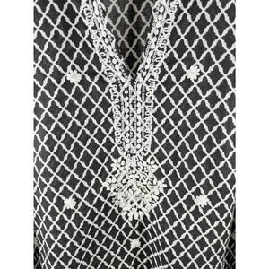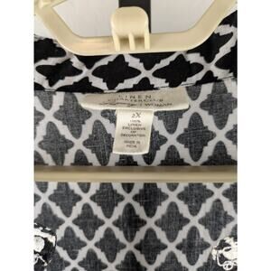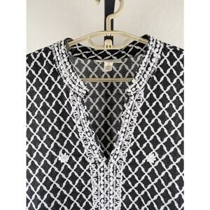 Charter Club Luxury size 2X 100% Linen Tunic Top. 3/4 length sleeves, stand up collar with v-neck, side slits. Black with white print. Beautiful embroidery and beading at the neckline, down the front and in flower detail on body of shirt.