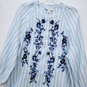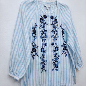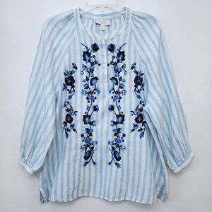 Charter Club Luxury Women's Embroidered Linen Henley Top in Blue Glacier Large
