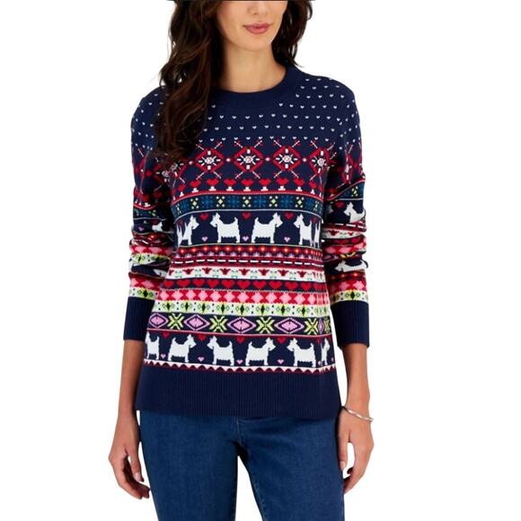 Classic Charter Club Fair Isle knit sweater in a rich navy base with multicolor holiday patterning throughout. Features traditional winter motifs with a cozy, timeless feel—perfect for cold-weather layering, holiday gatherings, or après-ski styling. Soft knit with ribbed cuffs, neckline, and hem for a comfortable, flattering fit.