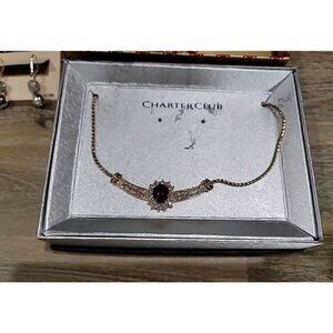 Elevate your accessory game with this exquisite mixed lot from Charter Club and Nine West. The ensemble includes two stunning necklaces, one adorned with ruby red crystals and the other with lustrous pearls, both showcasing intricate designs that promise to add a touch of elegance to any outfit. Accompanying the pearl necklace is a pair of pearl earrings, each piece meticulously crafted to enhance your fashion statements.