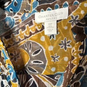 Elevate your wardrobe with this vibrant Charter Club paisley print blouse in size 12P petite. Featuring a striking mix of gold, teal, brown, and cream tones, this top adds a bold yet elegant touch to any outfit. Designed with flattering 3/4 sleeves, button accents, and a lightweight flowy fabric, it offers both comfort and style.