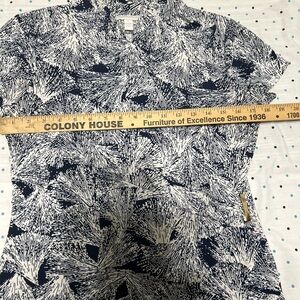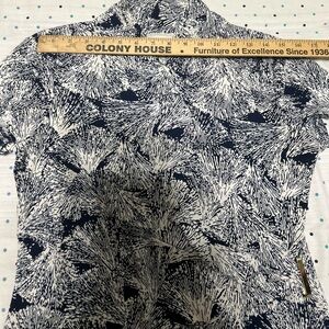 Stylish short-sleeve top. Features a unique navy and white pattern. Perfect for casual wear or the office!