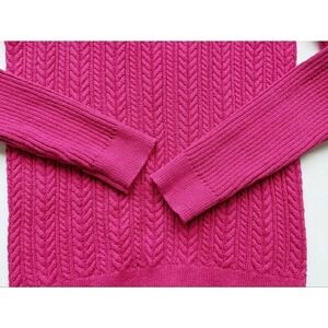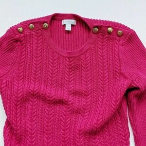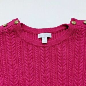 Pretty in pink, looks most like fuchsia to me. Functional brass buttons on shoulders. Worn once, line dried, but is showing some slight wash wear. Very pretty cable knit pattern. Smoke, pet, and fragrance free shop. BIN: 32220M18 #cableknit #sweater #spring #charterclub #brass #gold #pink #fuchsia #valentines