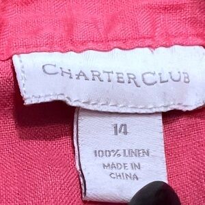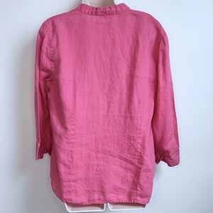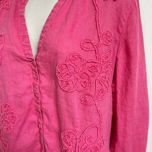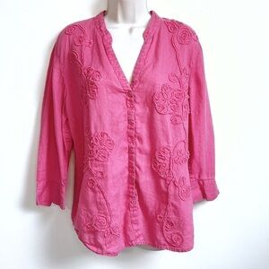 Charter Club Pink Linen Floral Button Down V Neck 3/4 Sleeve Top Blouse Size 14