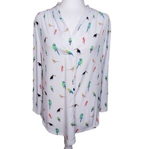Charter Club Printed Pleat Neck Top 3/4 Length Sleeves Tropical Bird Blouse Sz M