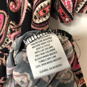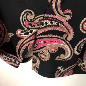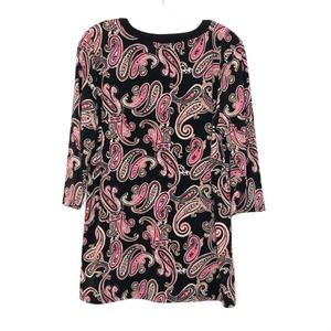 Pullover 3/4 sleeve blouse, black w/paisley design in pink/red/white/beige. Gold detail at front, ~3" slits on sides at bottom. Perfect with legging or jeggings.Size L