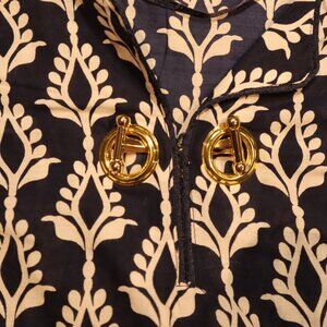 Charter Club lightweight sheer tunic top in a navy and tan boho print. Gold-tone clasp at the neckline, long sleeves, and a flowy, comfortable fit. Perfect with jeans or dress pants. Very light, breathable fabric.