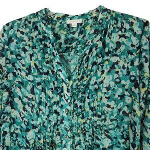Charter Club Green with Silver Metallic Thread Sheer Pintuck Button Up Top with 3/4 Sleeve