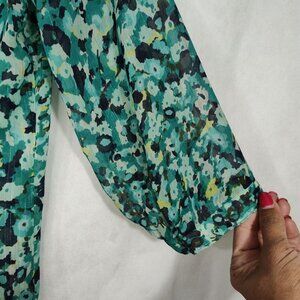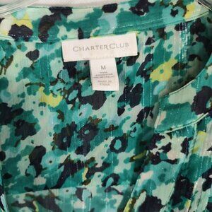 Charter Club Sheer Pintuck Top Women Size M Green Silver Metallic 3/4 Sleeve