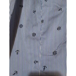 Sleeveless button front blouse with blue and white vertical stripes and navy embroidered anchors and ship wheels throughout.