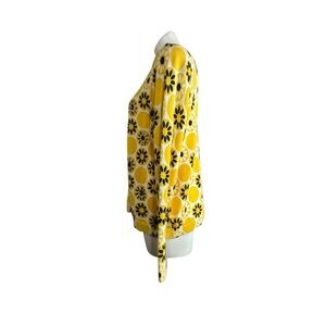 With the most beautiful spring sunny vibes has a rounded neck, white with black and gold medal pedals and black faux diamonds on the middle of some of the petals, front closure has yellow buttons. Three missing diamonds, but is not noticeable because of the design of the sweater. Some loose threads sweater has lots of stretch