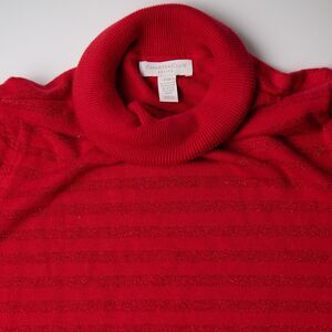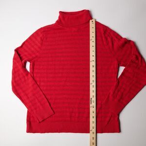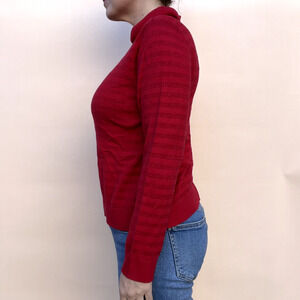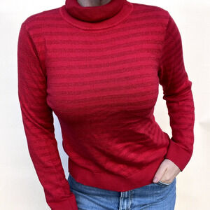 Stay cozy and chic with this Charter Club turtleneck sweater in a rich red hue. Designed for women’s Medium Petite sizing, this pullover features subtle horizontal stripes and a classic ribbed turtleneck, cuffs, and hem for a timeless look. Made from soft and breathable cotton, it’s perfect for layering or wearing on its own during cooler seasons. Pre-owned in great used condition, no stains, rips or tears. See photos as part of the description and for measurements