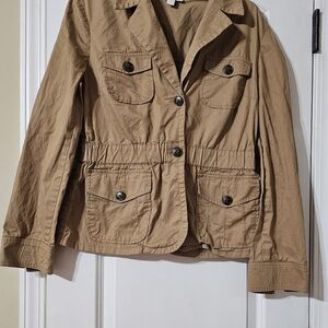 Stylish tan utility jacket by Charter Club. Features buttoned pockets and a tailored fit. Ideal for versatile layering. color may slightly differ due to lighting.