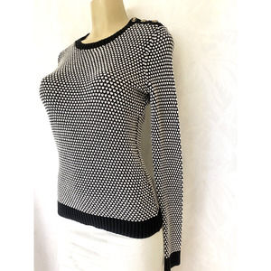 Charter Club Textured Crew Button Neck Sweater Black White Long Sleeve S