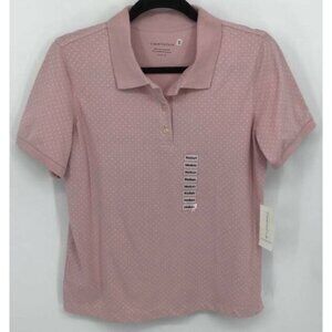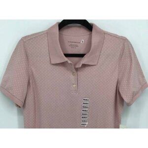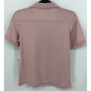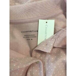A women's size medium top from Charter Club. The top is in pink and white with a polka dot pattern. The top is polo shirt style, collared neckline, button front, cap sleeves, stretch and is new with tags.