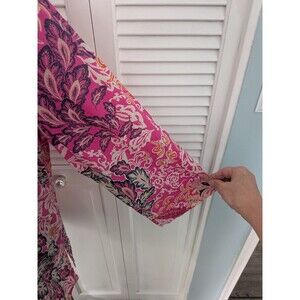 This Charter Club women's XL pink floral tunic features boho and cottagecore-inspired gold-stitched embroidery, making it perfect for travel, casual outings, or workwear. Perfect as a top or as a beach coverup. The relaxed fit, V-neckline, long sleeves, and pullover closure add to the comfort and ease of this lightweight cotton blouse. With a vibrant pink, orange, and gold color palette and a touch of Barbie-inspired character, this top is ideal for the spring, summer, and fall seasons. Machine washable and featuring casual sleeves, this tunic embodies a delightful blend of style and practicality for the modern woman.