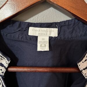 Charter Club Top Women 2X Navy Blue Embroidered Tunic Paisley Lightweight Casual