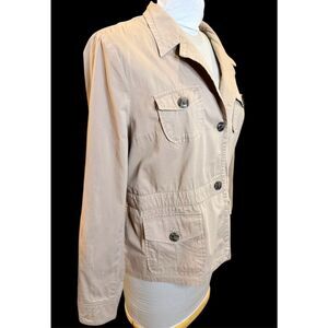 Utility/Safari jacket by Charter Club, size petite large. Button up front with pockets. Unlined, lightweight and packable. Tan/khaki.