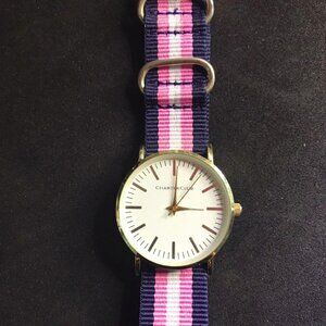 Stylish and casual, this Charter Club Model 17760 wristwatch features a white dial with gold-tone hands and a striped fabric strap in navy, pink, and white. Perfect for everyday wear or adding a pop of color to your outfit. Condition: Brand new appearance, requires new battery Strap: Fabric, multicolor Dial: White with gold-tone hands