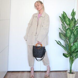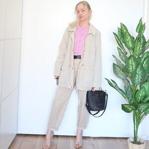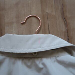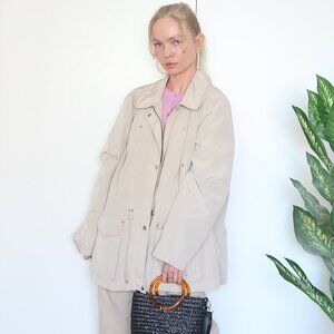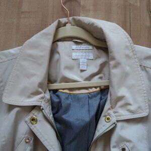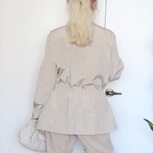 Elegant tan / beige jacket / trenchcoat. An ideal piece for this fall or a bit chilly summer night! The material is light and water-resistant. Golden details in the form of zippers, buttons, and drawstrings. Get a comfortable oversized look keeping drawstring loose, or accent your waistline for a more feminine look. Big, functional front pockets. Has a light pink marking on the back of the collar and lining, otherwise perfect!