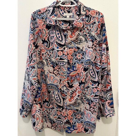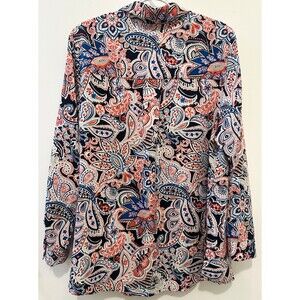Charter Club Woman 1X Paisley Button Front Blouse Navy Coral Long Sleeve