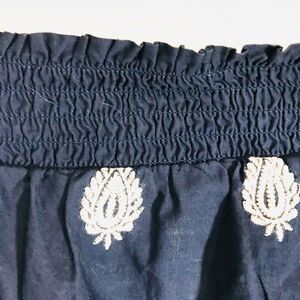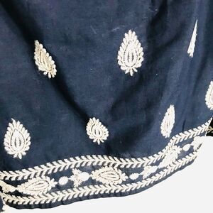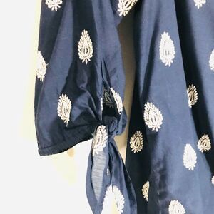 Excellent Condition. Like New. Charter Club Woman Embroiled Top. Navy Blue. Boho. Costal tied sleeves. Tunic Office casual. Medium. 100% cotton. 100% polyester. 21” from pit to pit. 27” length from shoulder