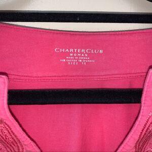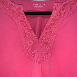 Charter Club Woman Pink 3/4 Sleeve V-Neck Shirt With Embroidered Floral Design | Side Slits