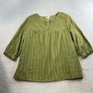 Charter Club Woman Plus 16W Blouse Green Eyelet Boho Peasant Keyhole 3/4 Sleeve